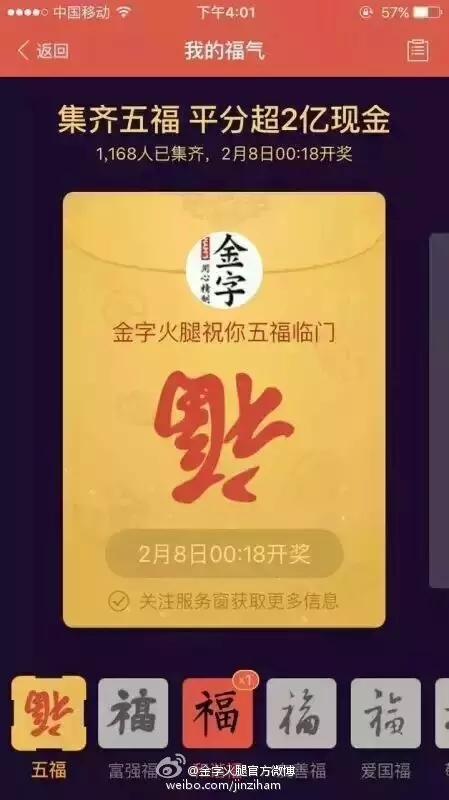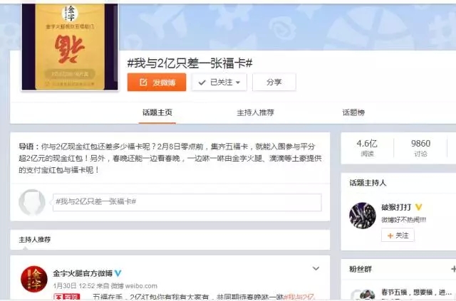 自前幾天支付寶將“集5福,搶2億+紅包”的活動規(guī)則公布后,一時間,有關??〒Q贈的話題強行霸屏。在有金字粉絲集齊了五福后,金字順勢在微博平臺上策劃的#我與2億只差一張???的微話題就引發(fā)了高達4.6億的閱讀量,網友們通過點贊評論及轉發(fā)分享的方式,第一時間表達了自己對于五福福卡和春晚2億紅包的高度期待!